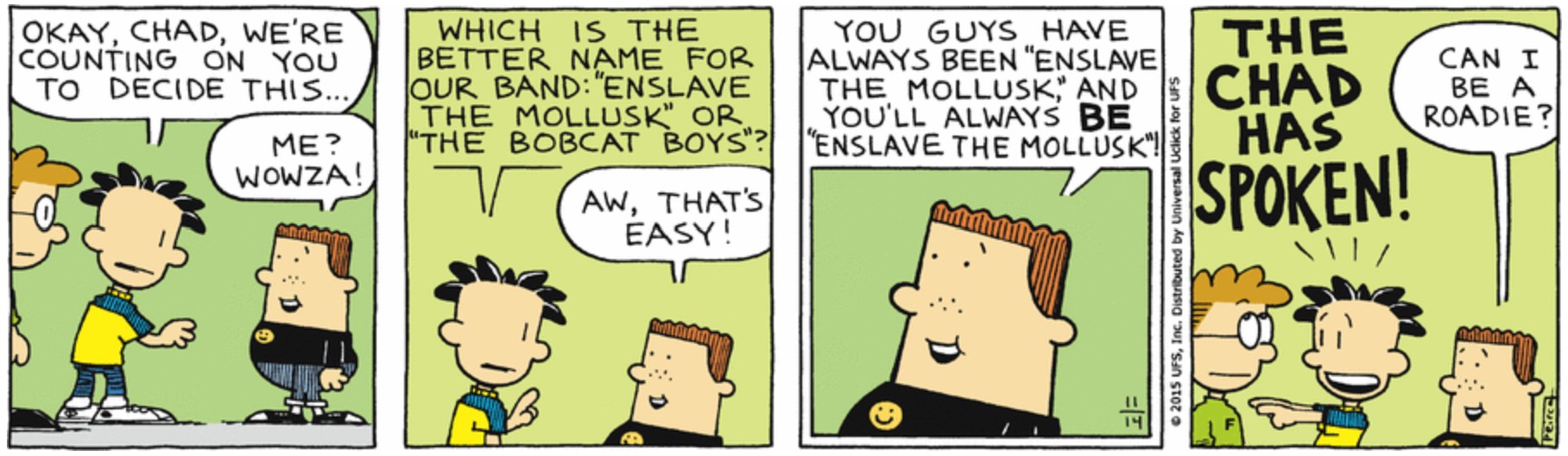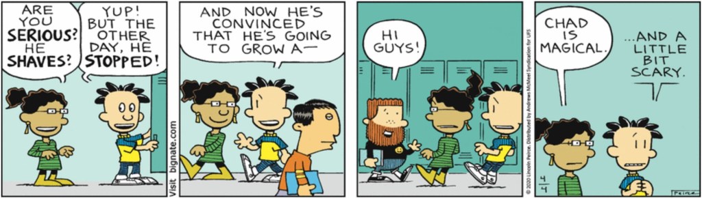 What they did with Chad was kind of odd. There is little to no emphasis on some of his most important character traits. His love of food is mentioned in “Valentine’s Day of Horror”, but mostly in passing, while his cuteness and the Power of Chad aspect of his character has not been mentioned yet. The short “How To Get Ripped or Die Tryin” reveals that he has chest hair which echoes a 2020 strip in which he grew a beard, yet he’s hairless in the locker rooms in “The Legend of the Gunting”. The random statements he makes and his behavior are also much weirder than they are in the strip and books. This is most striking in “Belles A Ringin”, where he accidentally ends up in the girl’s bathroom and ends up going insane from staying there too long due to not wanting the girls to catch him leaving. All of these are easy to improve upon, though, and I think Charlie Schlatter gives him the perfect dialect.