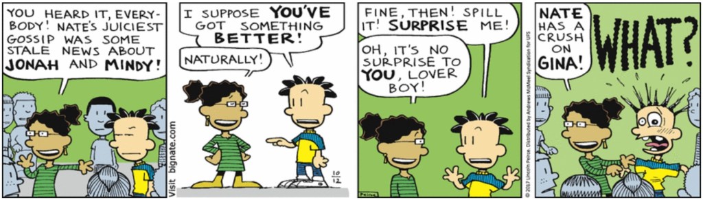 So, the Big Nate television series was released not on Nickelodeon, but on Paramount+ this February, and it is…interesting to say the least. The series has received positive reviews for its animation, art style and most of the character design, while receiving negative reviews for some of the voice roles, the slight inaccuracies to the strip and books, and perhaps worst and most unexpectedly off all, its use of, well…bathroom humor. 🤮 (Guess we’ve learned nothing after all these years.)