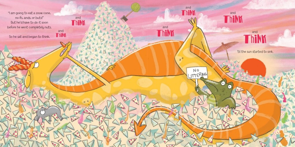 Throughout the book, the dragon appears to have a sidekick that looks like some kind of rodent, though this isn’t mentioned in the text. At first, I thought it was a squirrel, until squirrels appear later in the story, who look very different from the dragon’s sidekick, so then I figured that it was a chinchilla, so that’s what I’ll call it. On the first page, the chinchilla has its ear on fire near the dragon’s melted snow cone, implying a pretty hilarious failure of the dragon’s Plan A, which does a good job at reeling the reader in. Illustrator Pauline Gregory does a great job at implementing these small visual gags throughout the story, from a crocodile holding a “No Littering” sign in a pile of melted snow cones to the chinchilla ending up in an ice cube at the top of a snowy mountain.